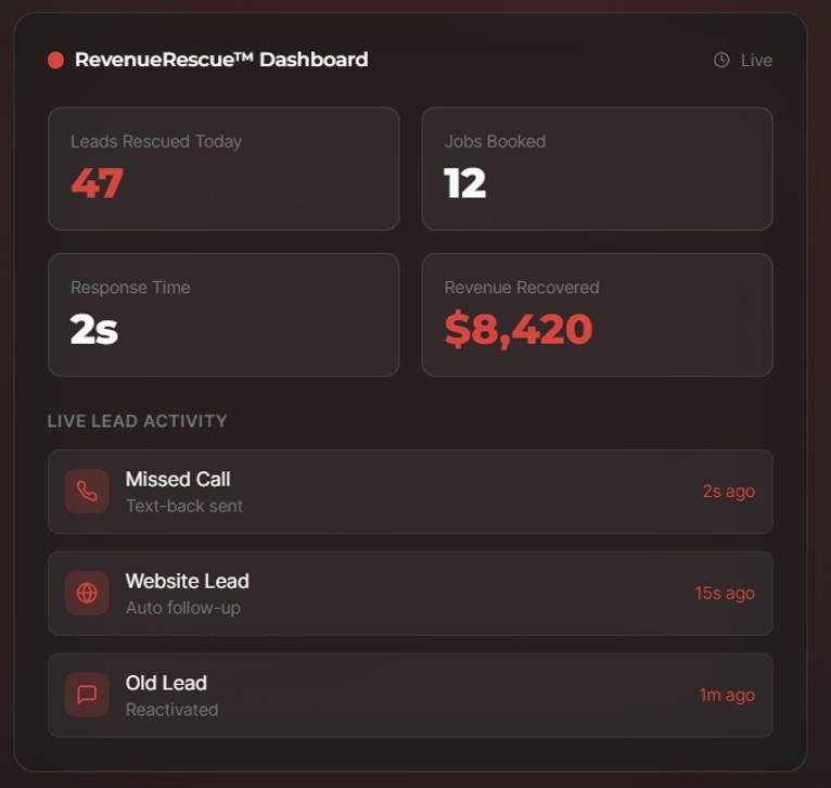 If you miss calls, forget to follow up, or rely on manual processes, you're already losing revenue. RevenueRescue™ fixes that with automated follow-up, instant response, and full-funnel nurturing - all running in the background.